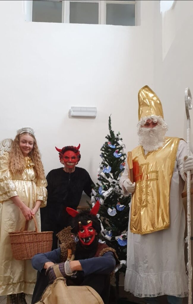 To, co na nás čekalo při příchodu do školy, nahnalo obavy i těm nejstatečnějším z nás. Všude poházené uhlí, brambory, třídy vzhůru nohama. V noci naši školu navštívili čerti a my jsme tušili, že se vrátí. Netrvalo dlouho a uslyšeli jsme řinčení řetězů. Naštěstí přišel i Mikuláš s andílkem. Zazpívali jsme jim písničky, slíbili, že se polepšíme a za odměnu jsme dostali balíčky plné dobrot. Čerti tak odcházeli s nepořízenou. Jakmile se za nimi zavřeli dveře, spadl nám obrovský kámen ze srdce. Tak zase za rok! ![]()